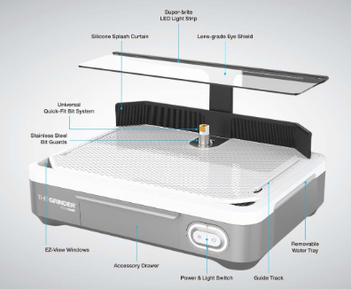 Unlike other grinders, the water reservoir comes equipped with a removable tray which can be easily emptied after use. With handles on each side, the lift-out tray makes cleanup simple and safe. Eliminate carrying a heavy awkward grinder to the sink or potentially spilling its contents on floors and work surfaces. Any accumulated glass grit can be cleaned out with the included scraper and disposed of or repurposed.