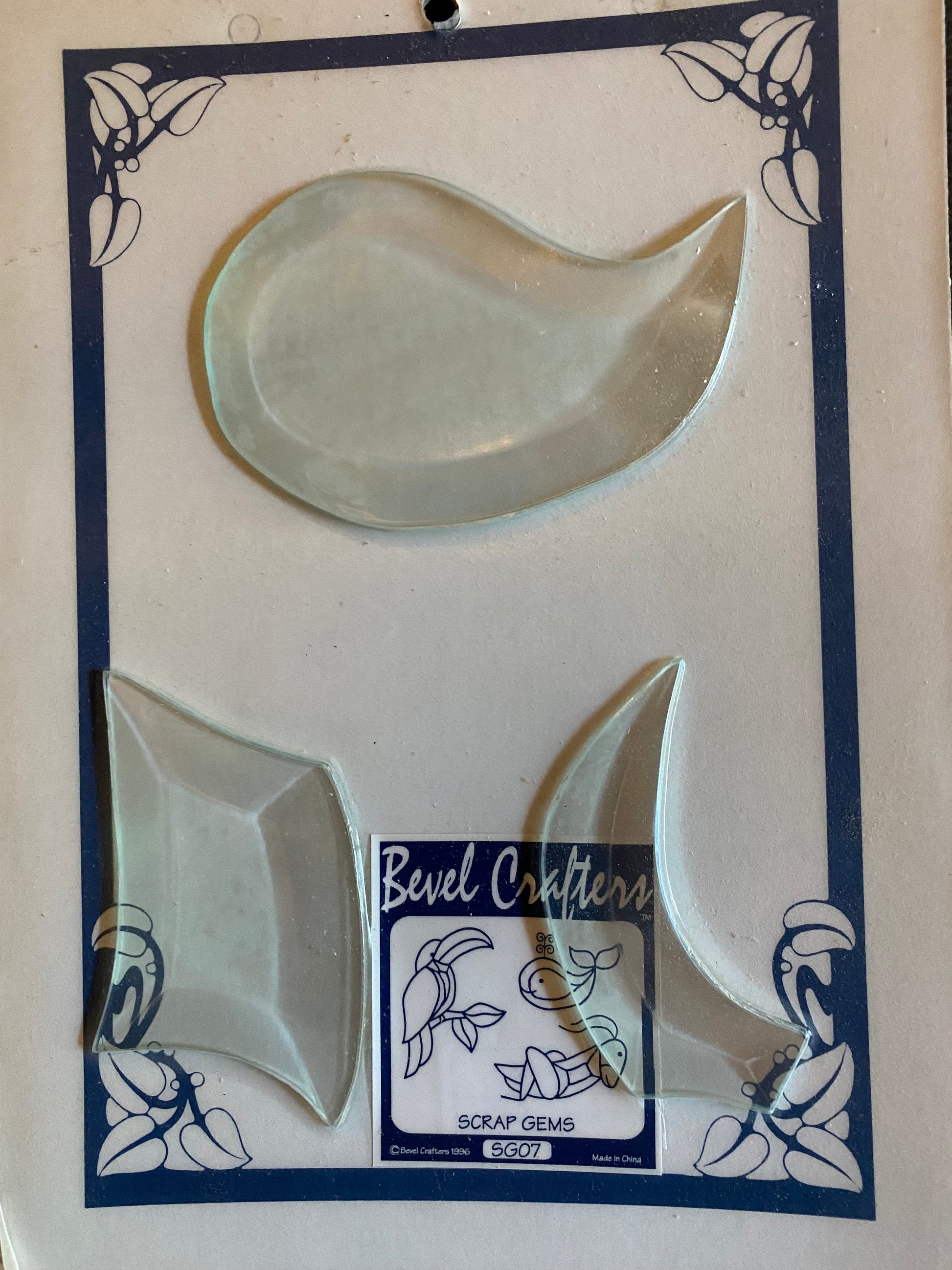 3 Beveled projects - a Toucan, Whale, and Grasshopper. Use your scrap stained glass to complete these whimsical animals. Each project comes with a pattern to cut the additional stained glass. 3 beveled glass pieces included. Beveled pieces are 3mm thick with 1/2" beveled edge. Each kit contains an assembly pattern and the beveled glass pieces needed to complete each suncatcher. Add jewels, colored glass, stampings, wire, squiggles, etc. to make one-of-a-kind creations. Sizes listed are approximate.